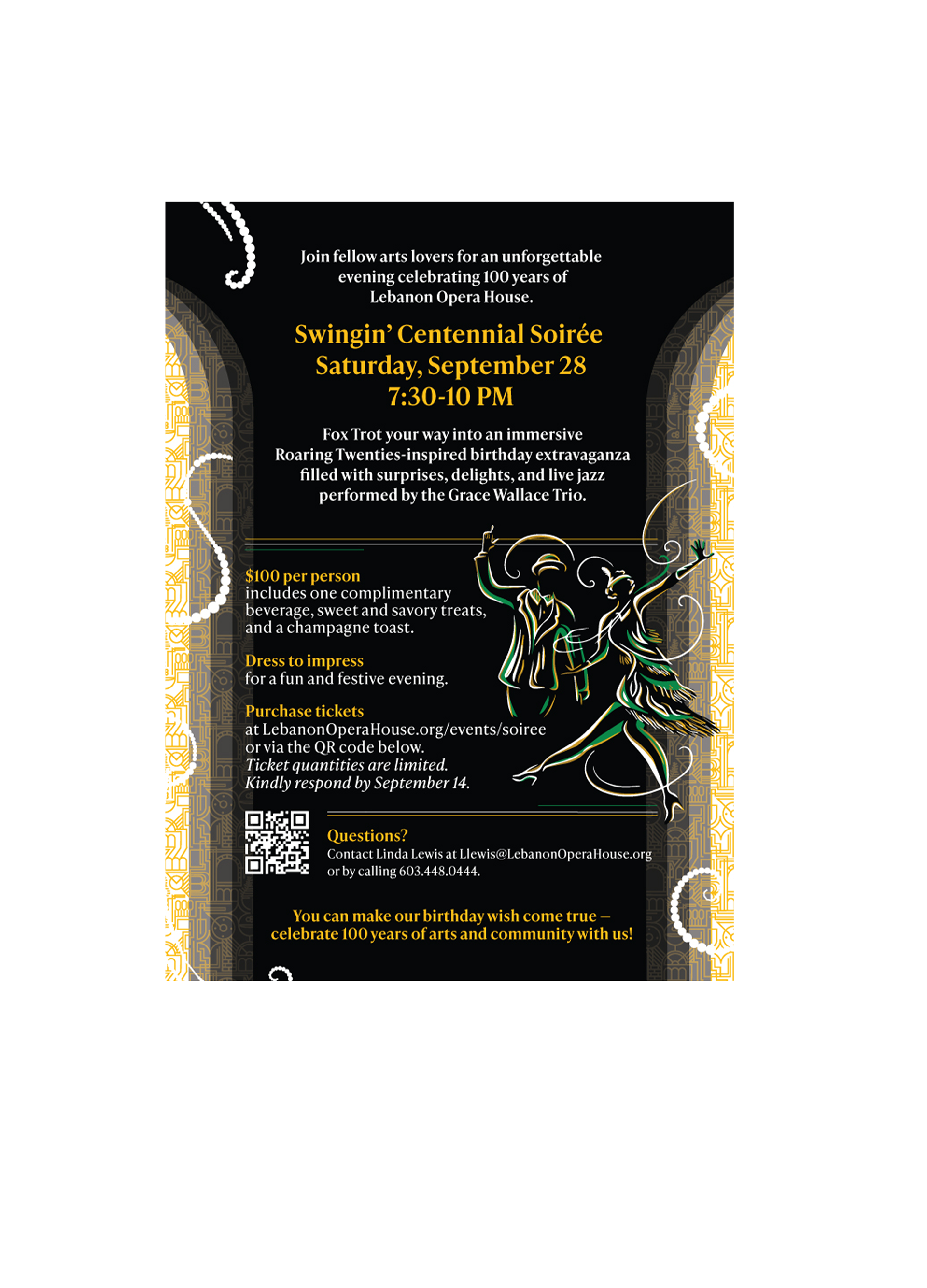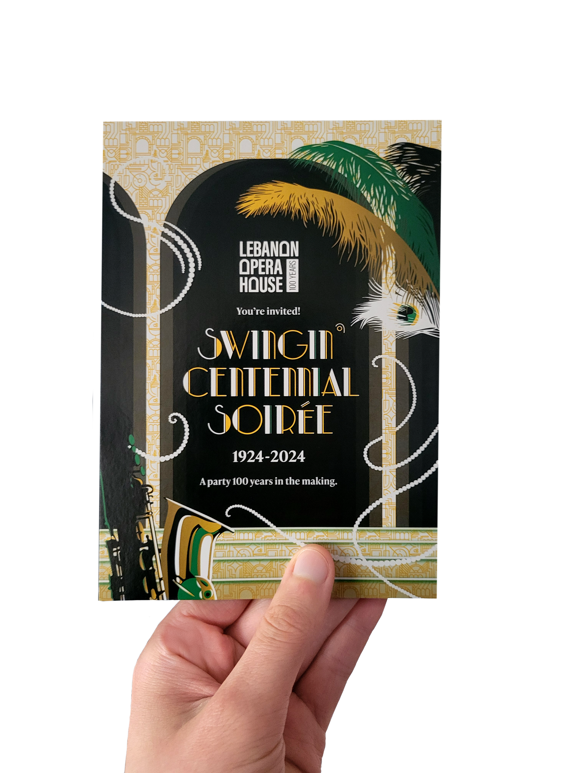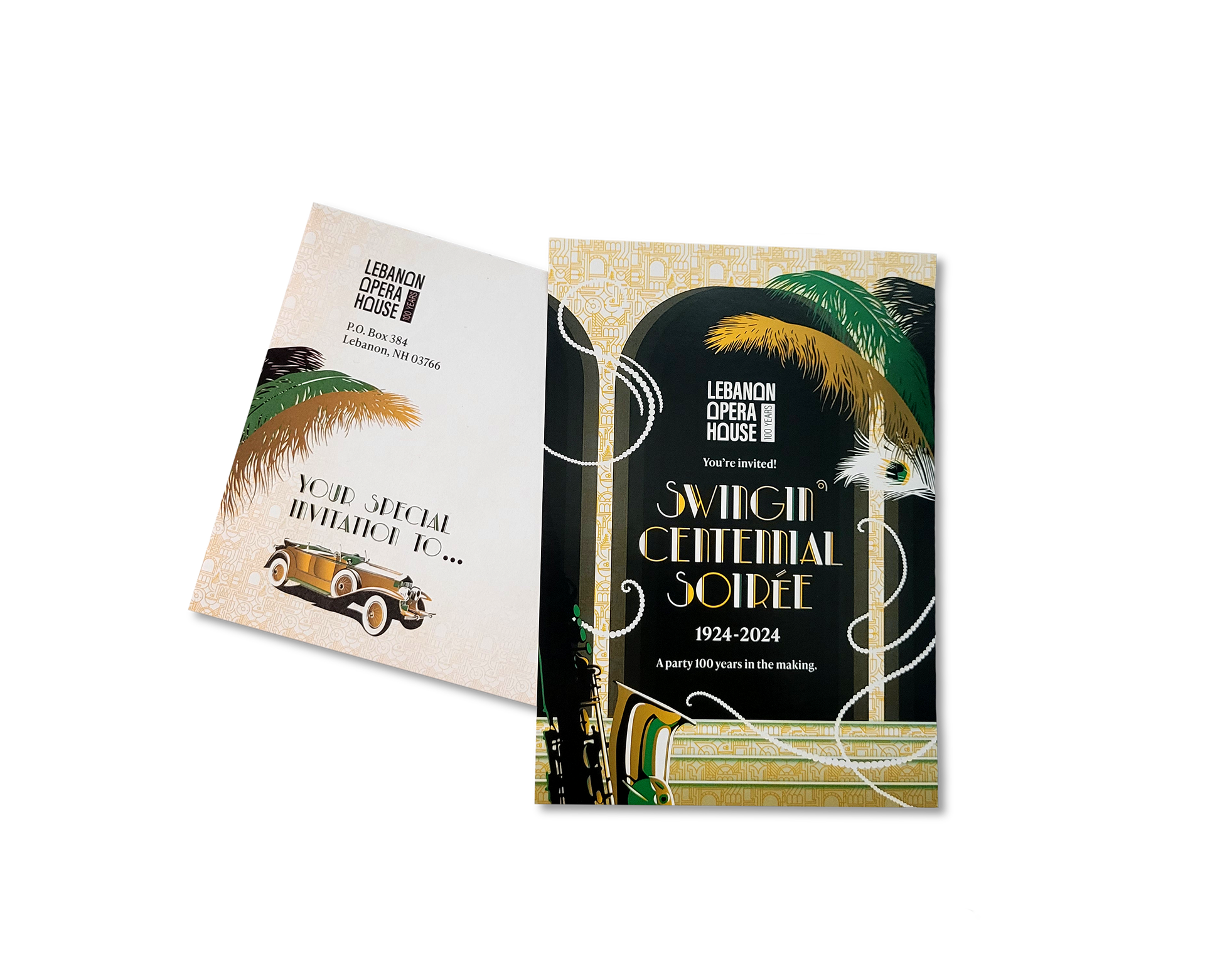 A postcard invitation and accompanying envelope for Lebanon Opera House’s 100th anniversary gala, inspired by the Roaring Twenties and “The Great Gatsby”.